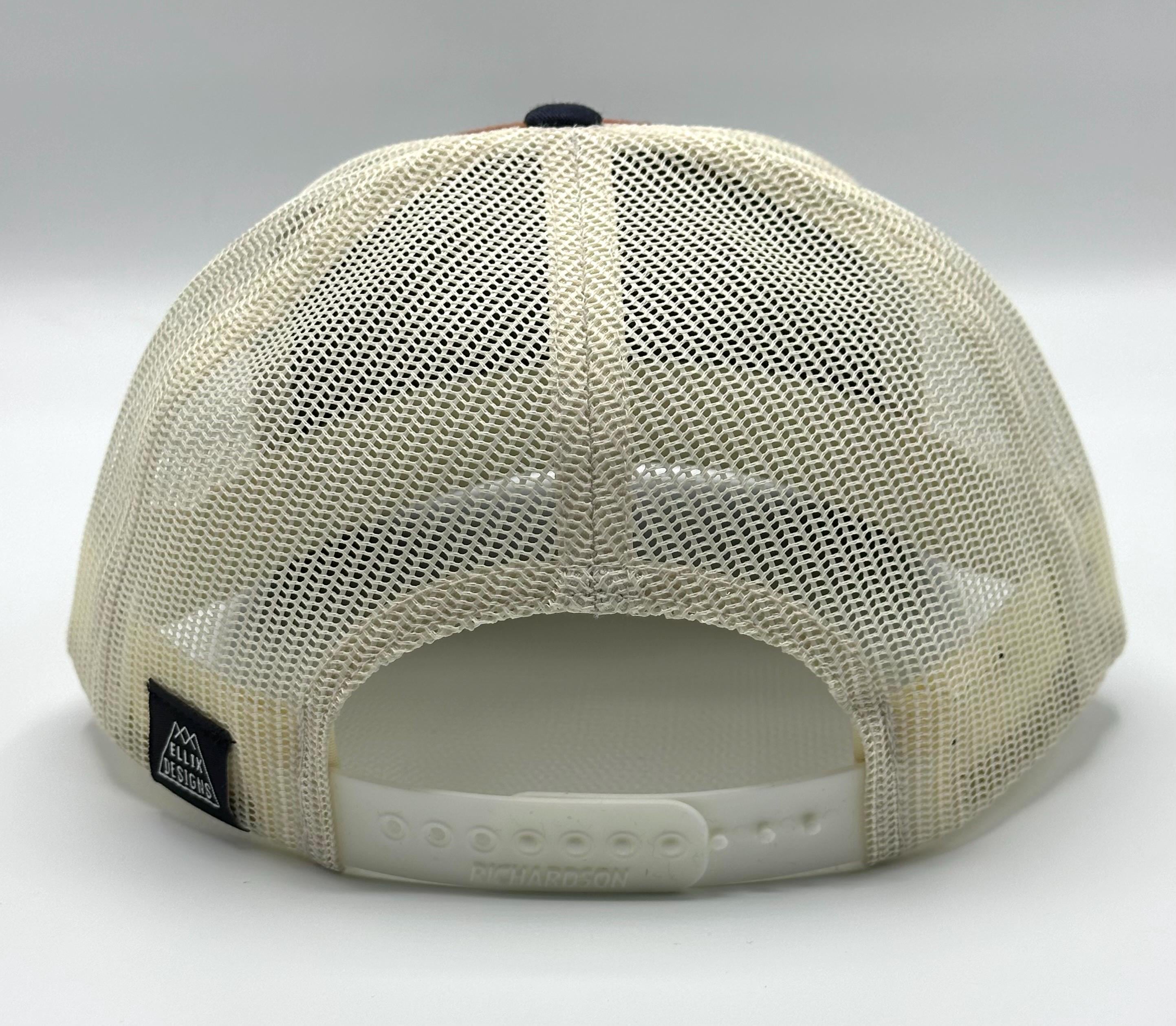 Ellix hats are a great way to look stylish while shading your face & protecting your head - from the mountain sun, the festival flare or the urban glow. Trucker hats are all-season apparel here in the mountains of Bend, Oregon - perfect for men and women, and this rust, navy and off-white Richardson cotton front hat has a one-size-fits-most adjustable snapback. This hat has a shorter profile, so it fits a little more snuggly than other trucker hats.