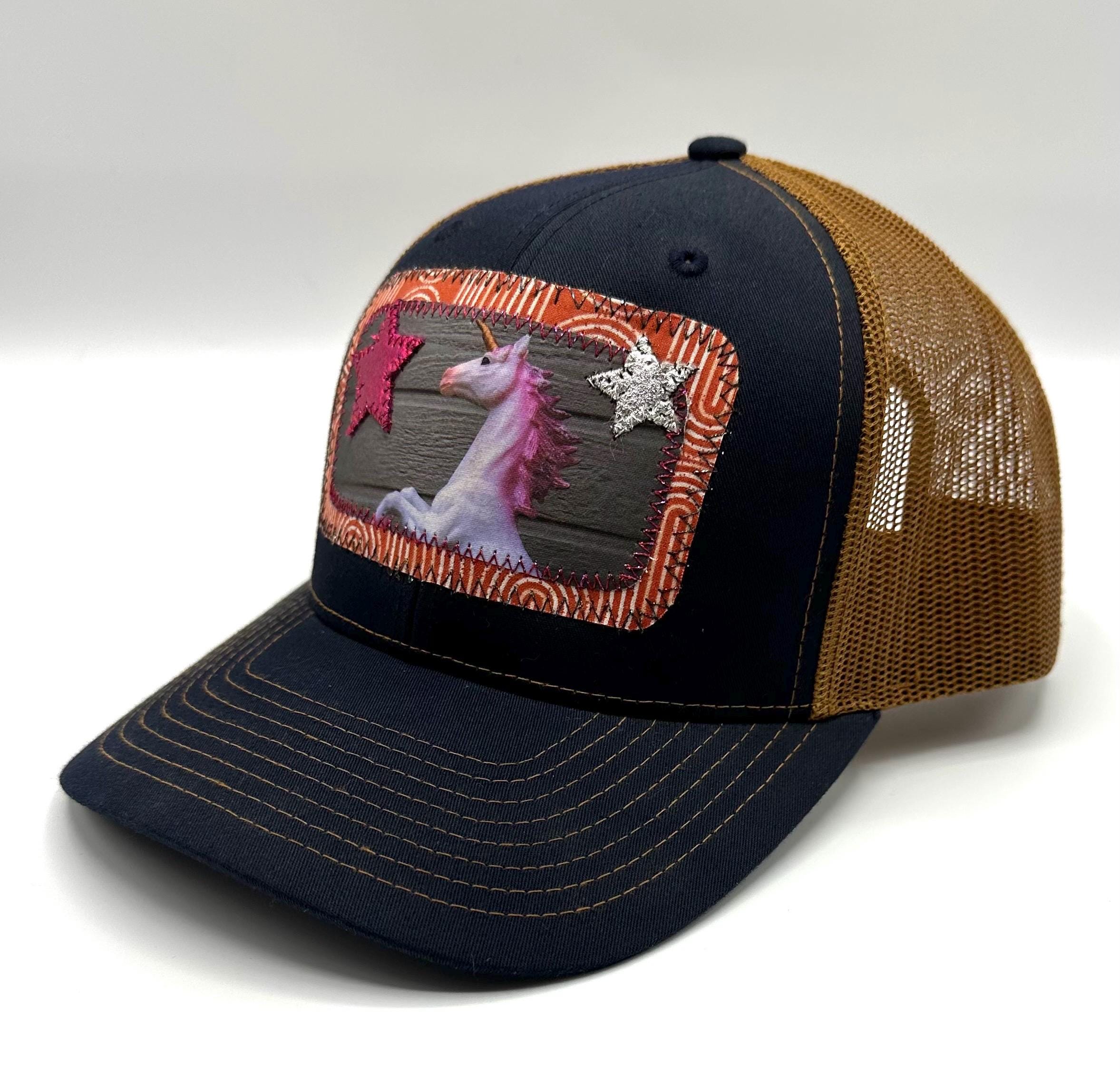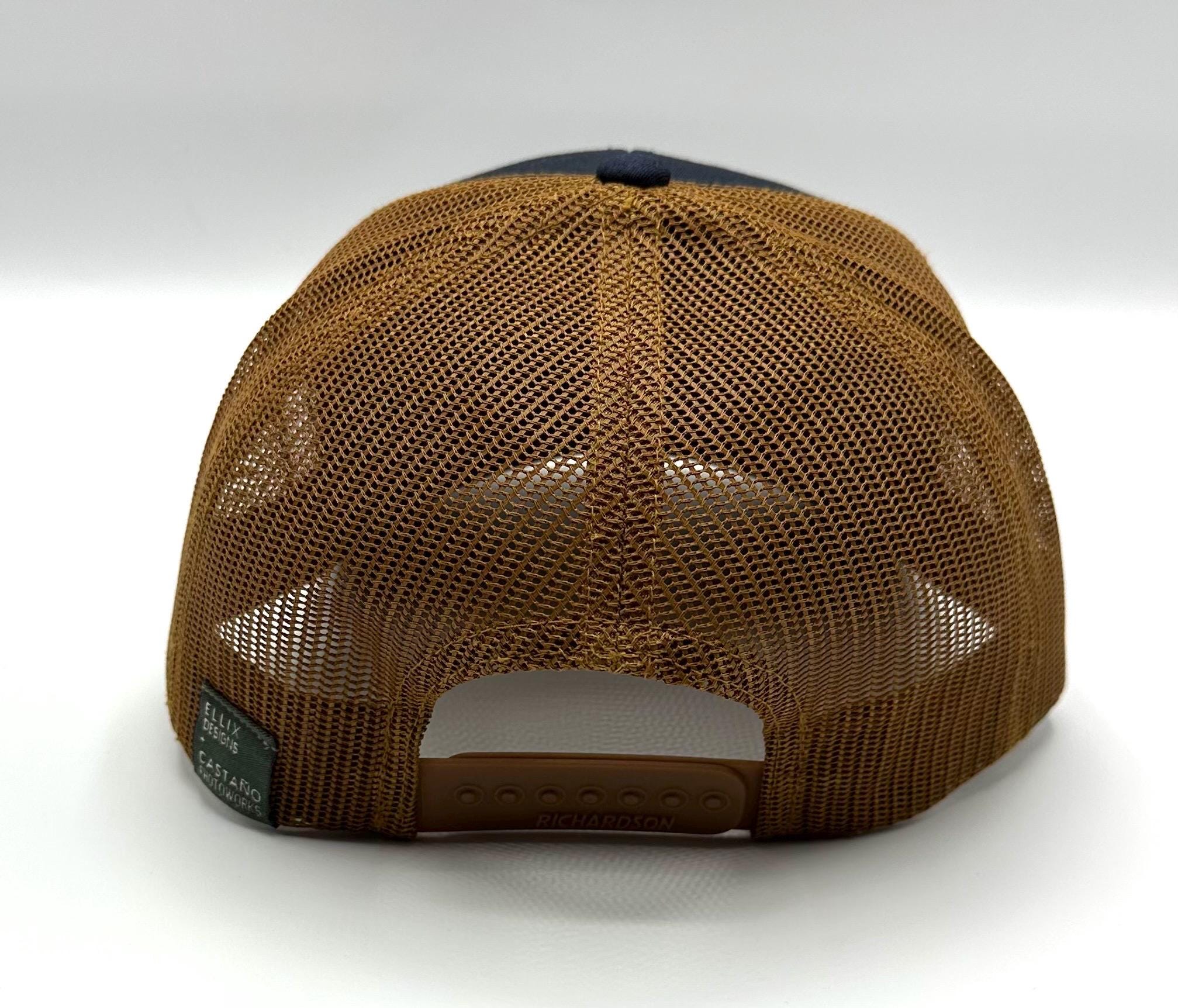 Ellix hats are a great way to look stylish while shading your face & protecting your head - from the mountain sun, the festival flare or the urban glow. Trucker hats are all-season apparel here in the mountains of Bend, Oregon - perfect for men and women, and this navy and bronze Richardson cotton front hat has a one-size-fits-most adjustable snapback. Original photo printed by fabric by Amy Castaño from Castaño Photoworks!