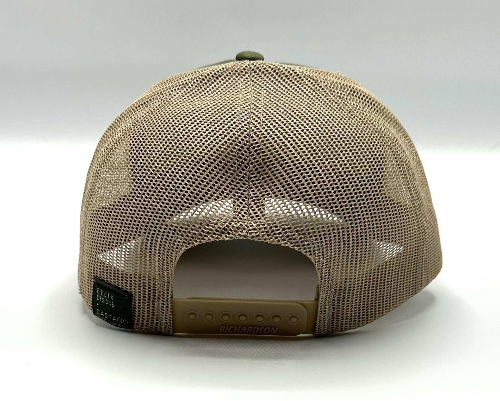 Ellix hats are a great way to look stylish while shading your face & protecting your head - from the mountain sun, the festival flare or the urban glow. Trucker hats are all-season apparel here in the mountains of Bend, Oregon - perfect for men and women, and this olive green and off white Richardson cotton front hat has a one-size-fits-most adjustable snapback. Original photo printed by fabric by Amy Castaño from Castaño Photoworks!