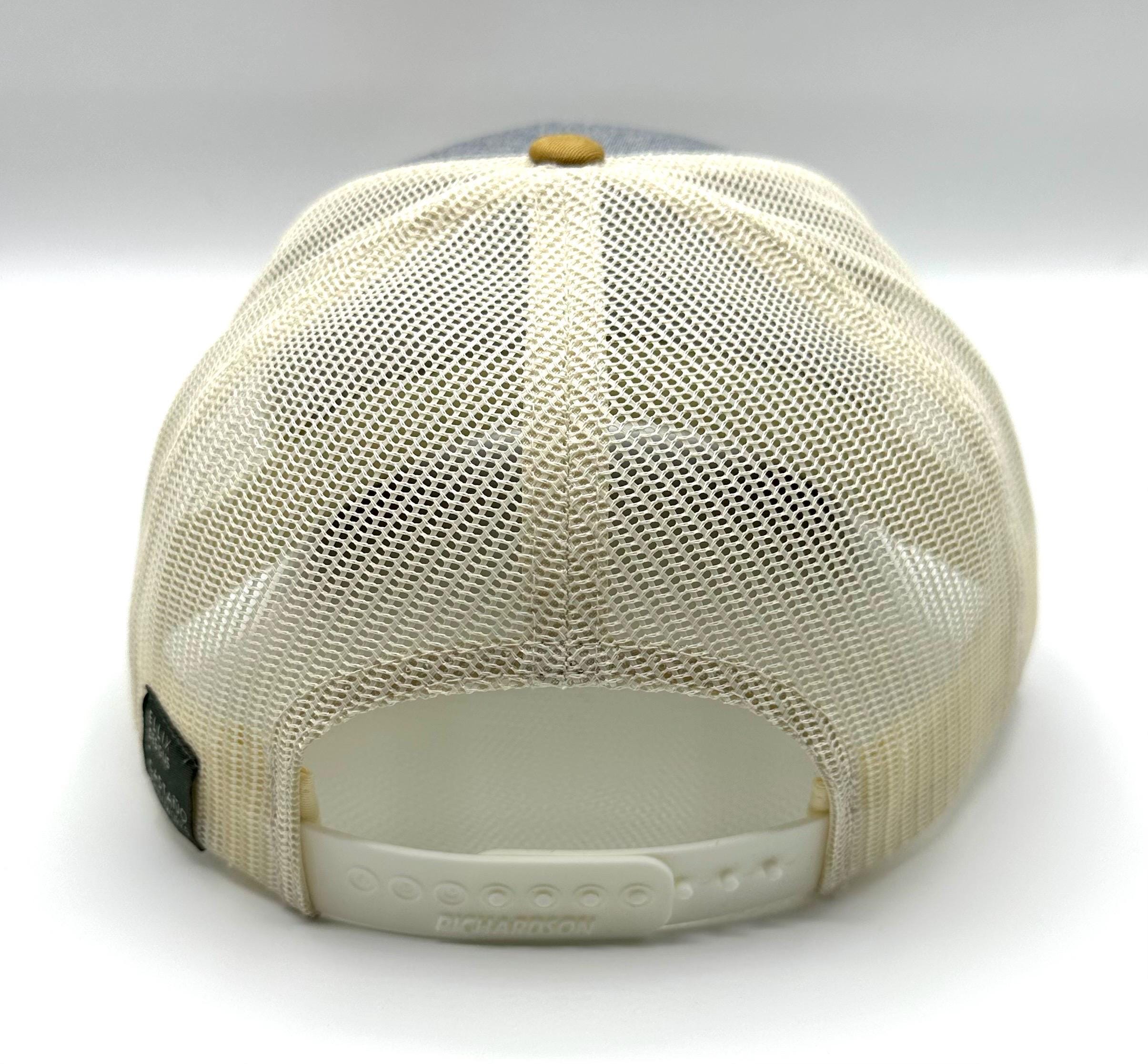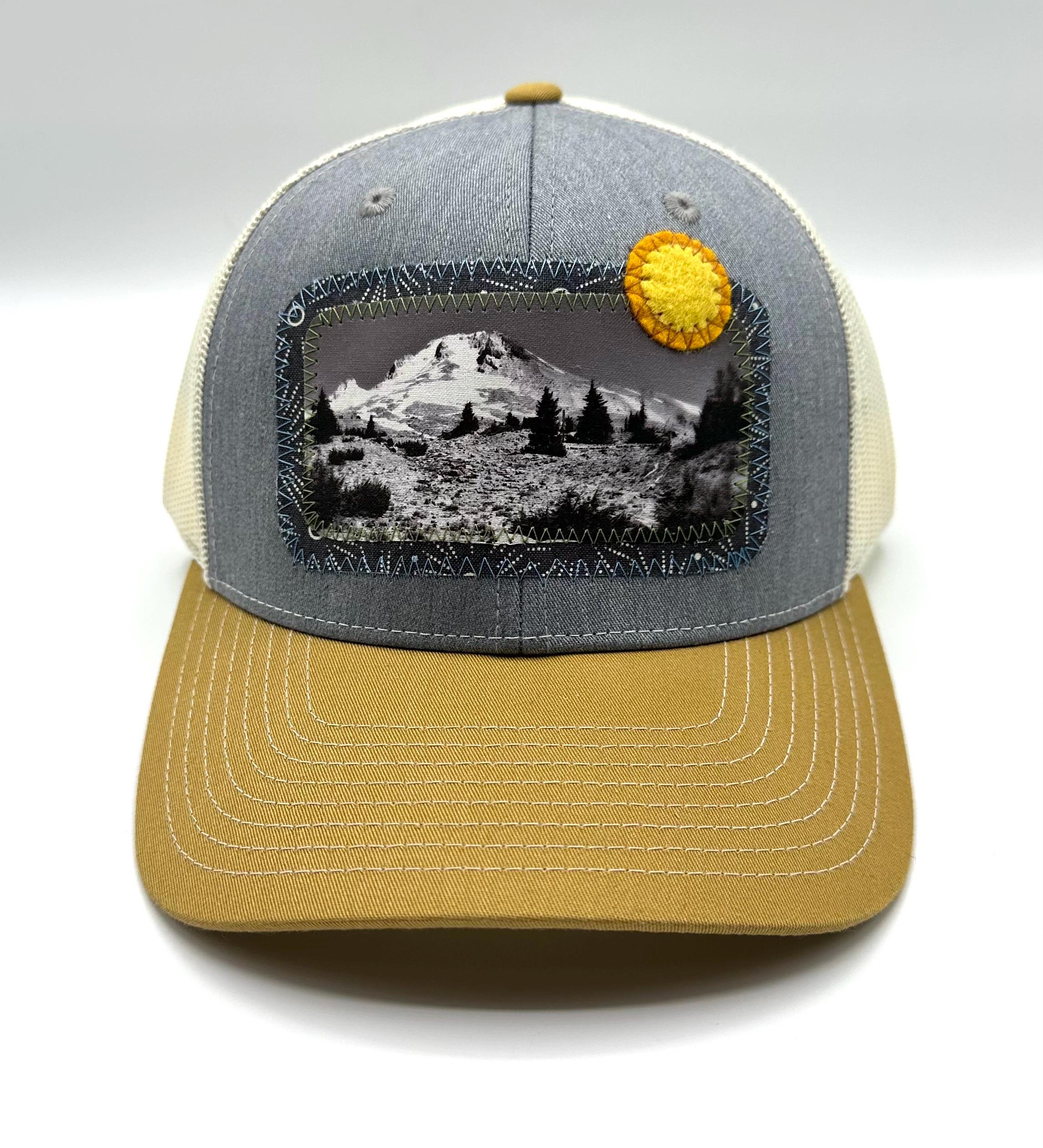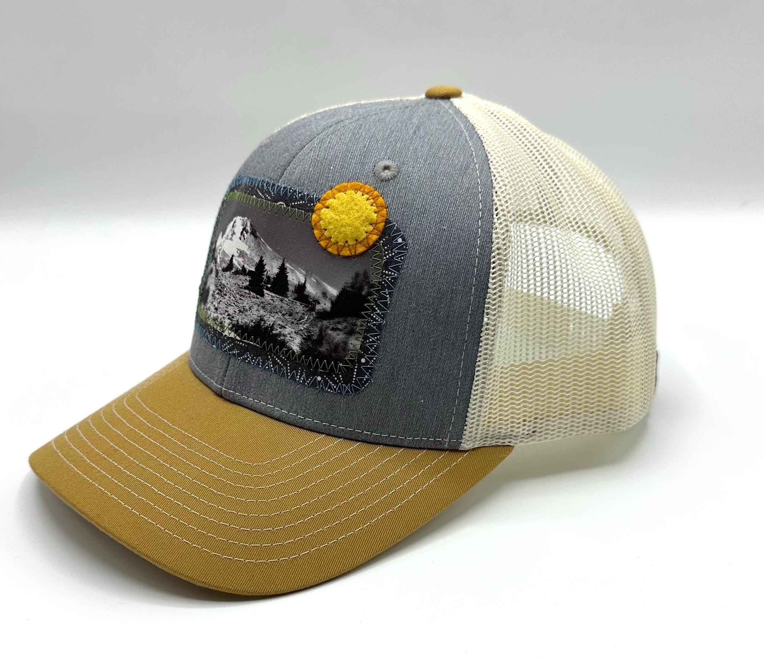 Ellix hats are a great way to look stylish while shading your face & protecting your head - from the mountain sun, the festival flare or the urban glow. Trucker hats are all-season apparel here in the mountains of Bend, Oregon - perfect for men and women, and this gray, tan and off-white Richardson cotton front hat has a one-size-fits-most adjustable snapback. Original photo printed by fabric by Amy Castaño from Castaño Photoworks!