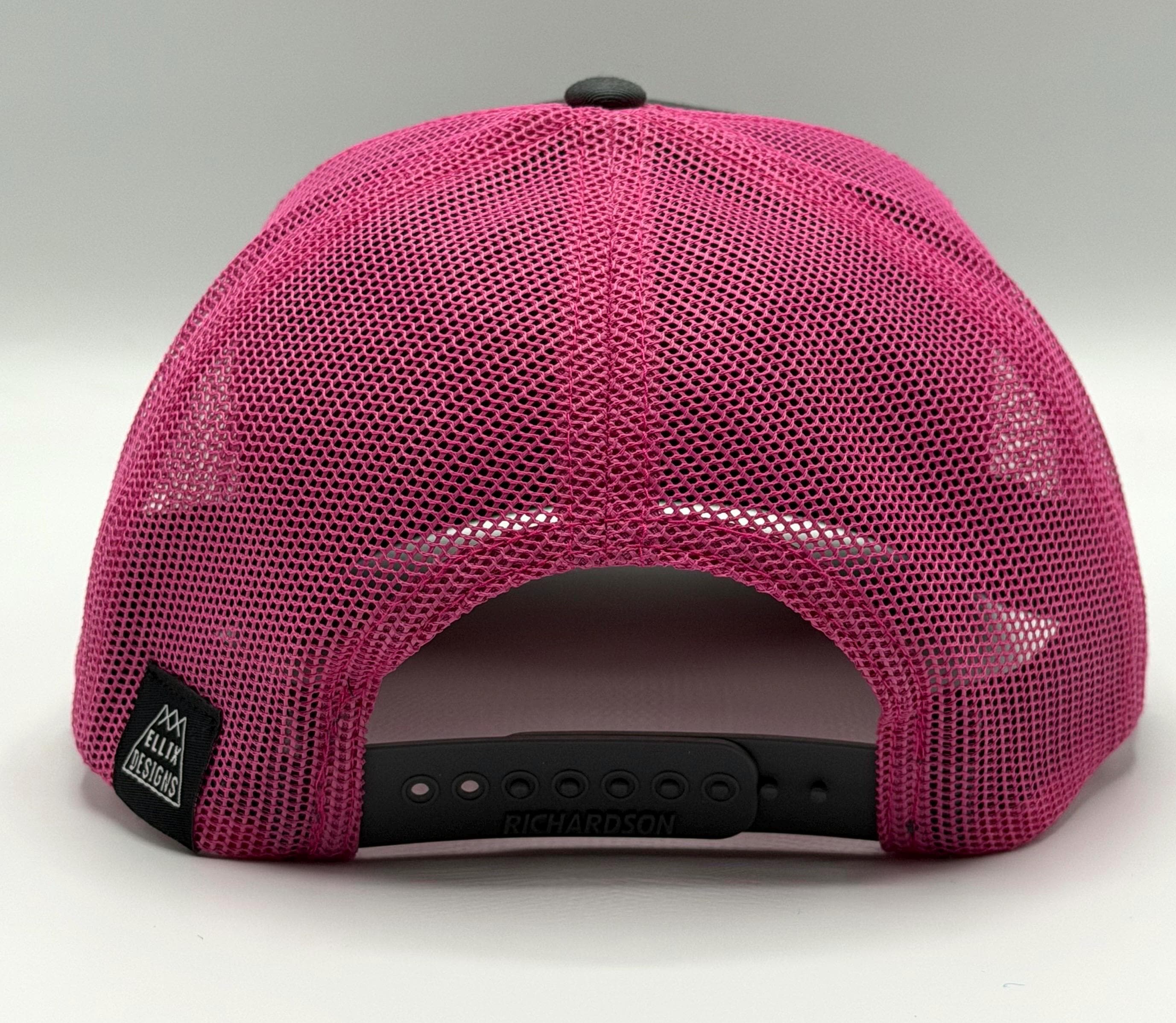 Ellix hats are a great way to look stylish while shading your face & protecting your head - from the mountain sun, the festival flare or the urban glow. Trucker hats are all-season apparel here in the mountains of Bend, Oregon - perfect for men and women, and this pink and gray Richardson cotton front hat has a one-size-fits-most adjustable snapback.